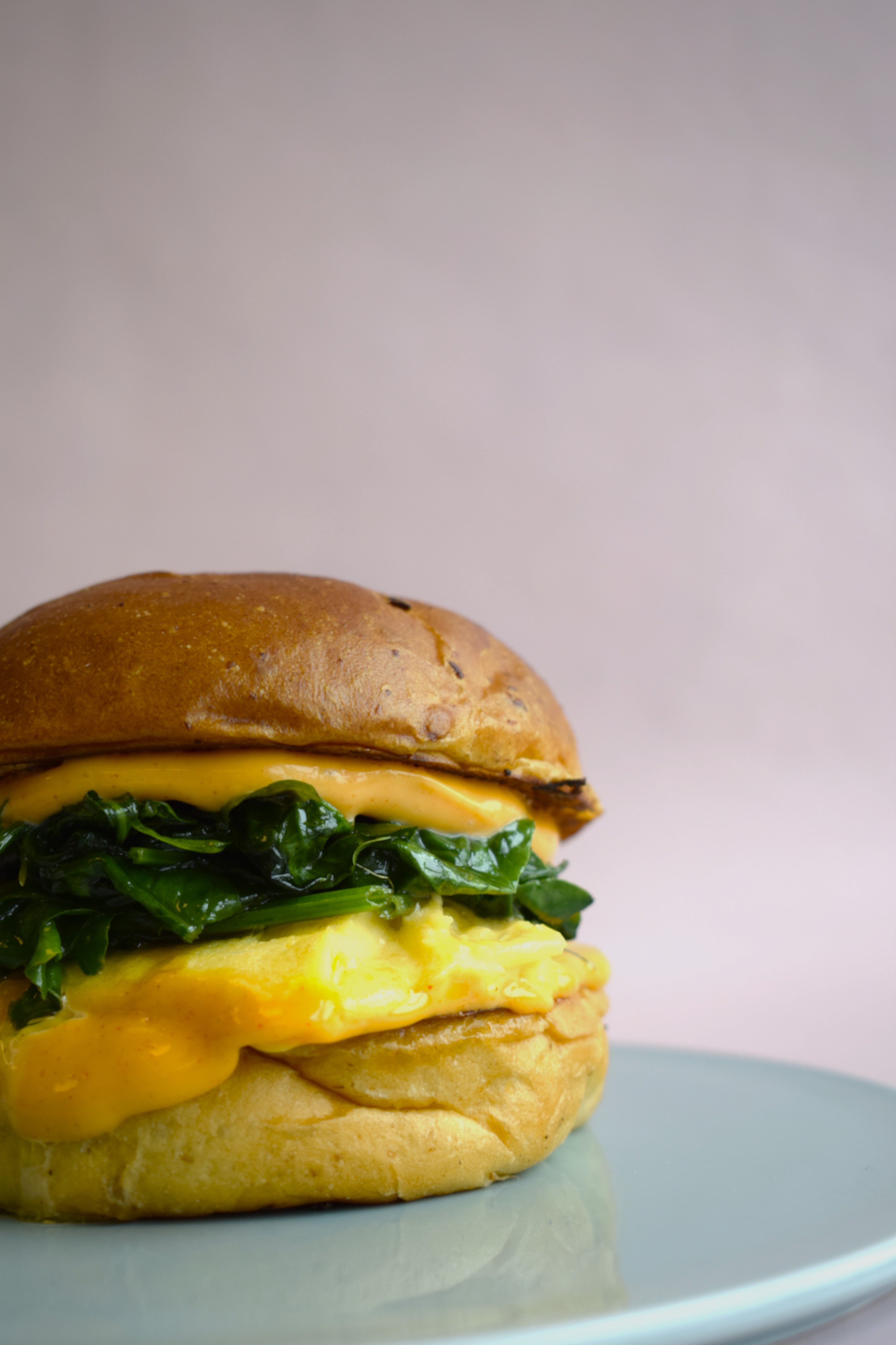 3. Steg bladspinaten på høj varme i den samme pande, indtil den er lige akkurat tilberedt. Læg den til side.