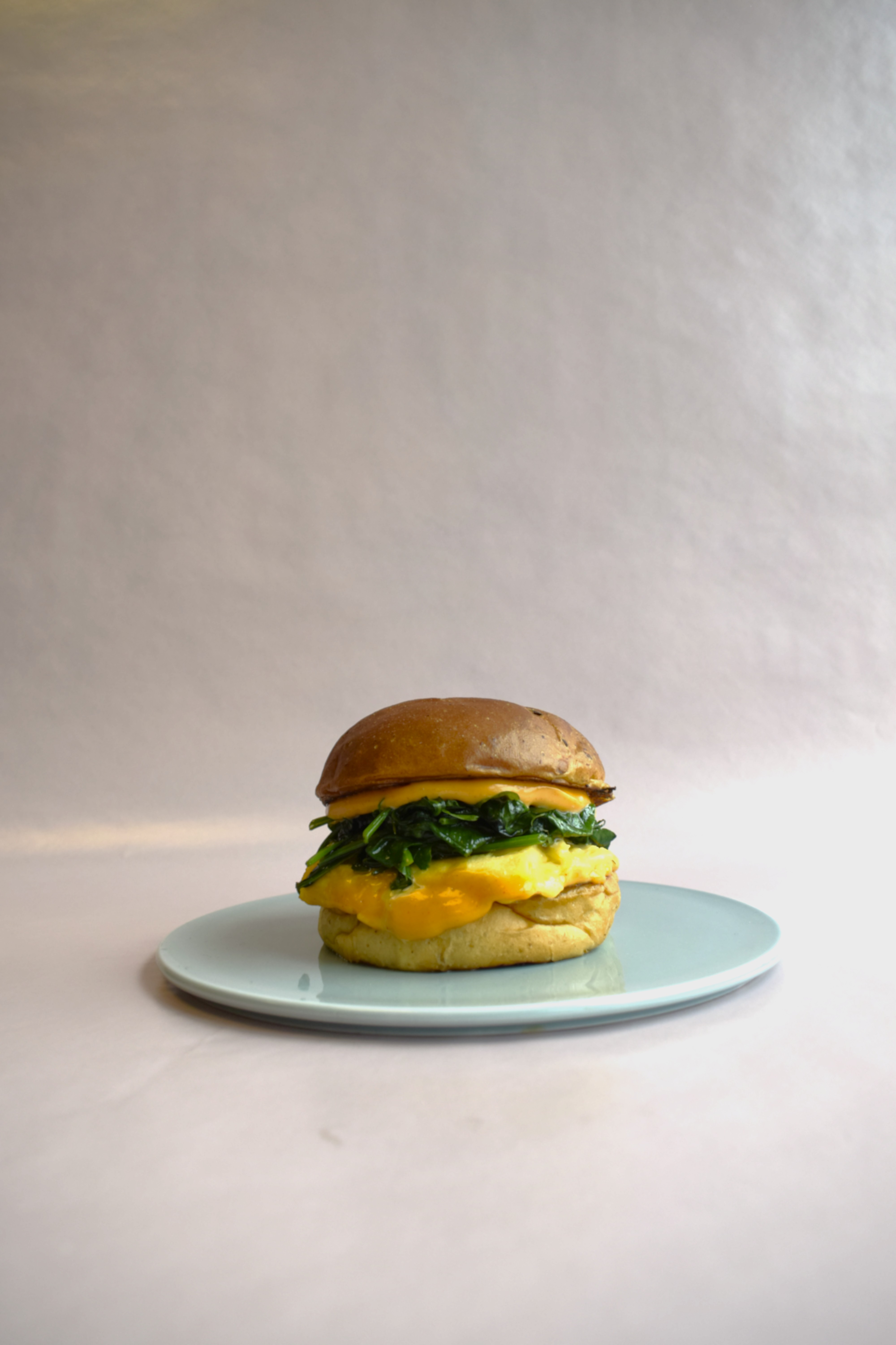 6. Når omeletten næsten har sat sig toppes den med cheddarost og foldes med den ene side over.