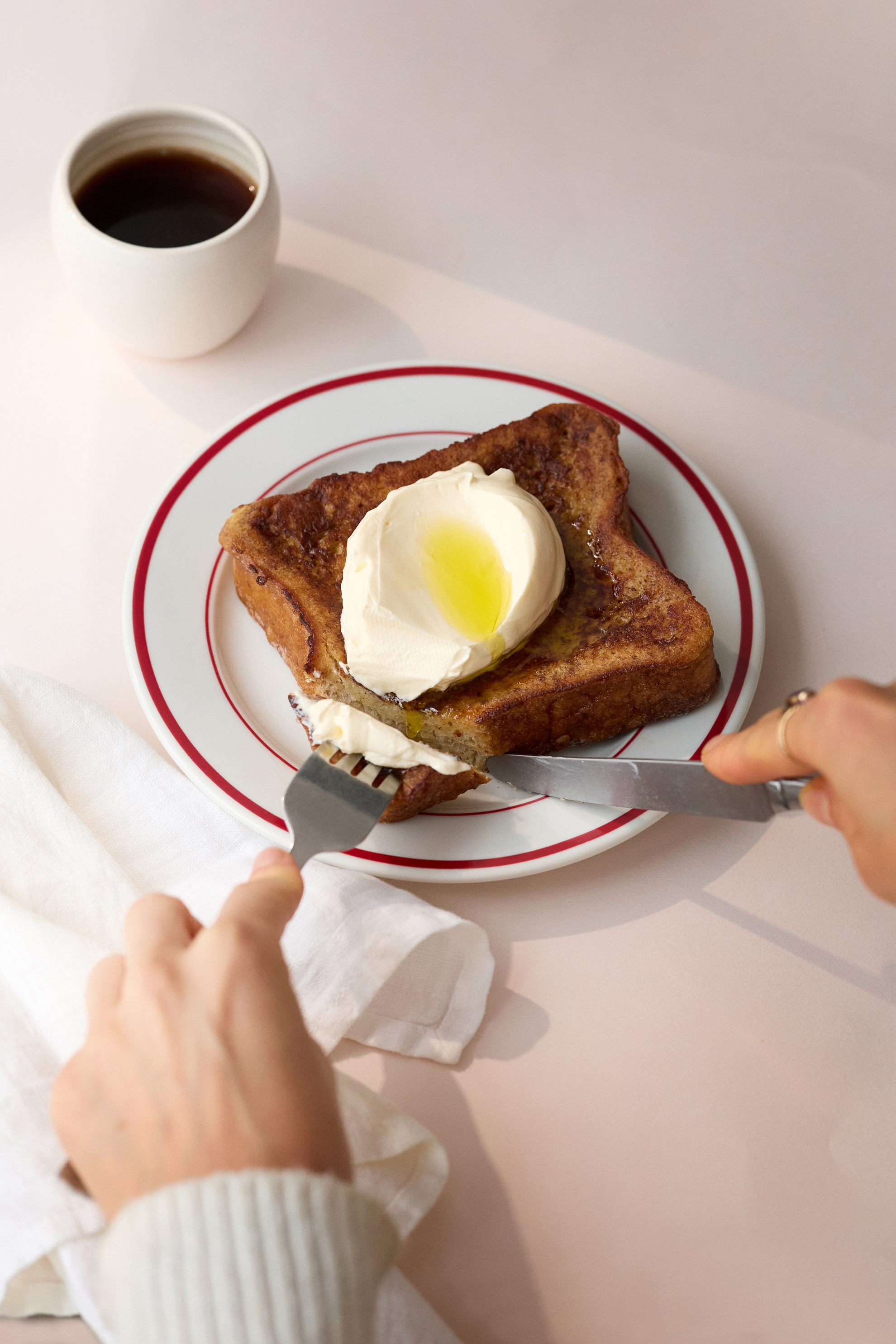 5. Servering: Anret de varme French Toast med en generøs klat mascarpone-creme på toppen og dryp med olivenolie.