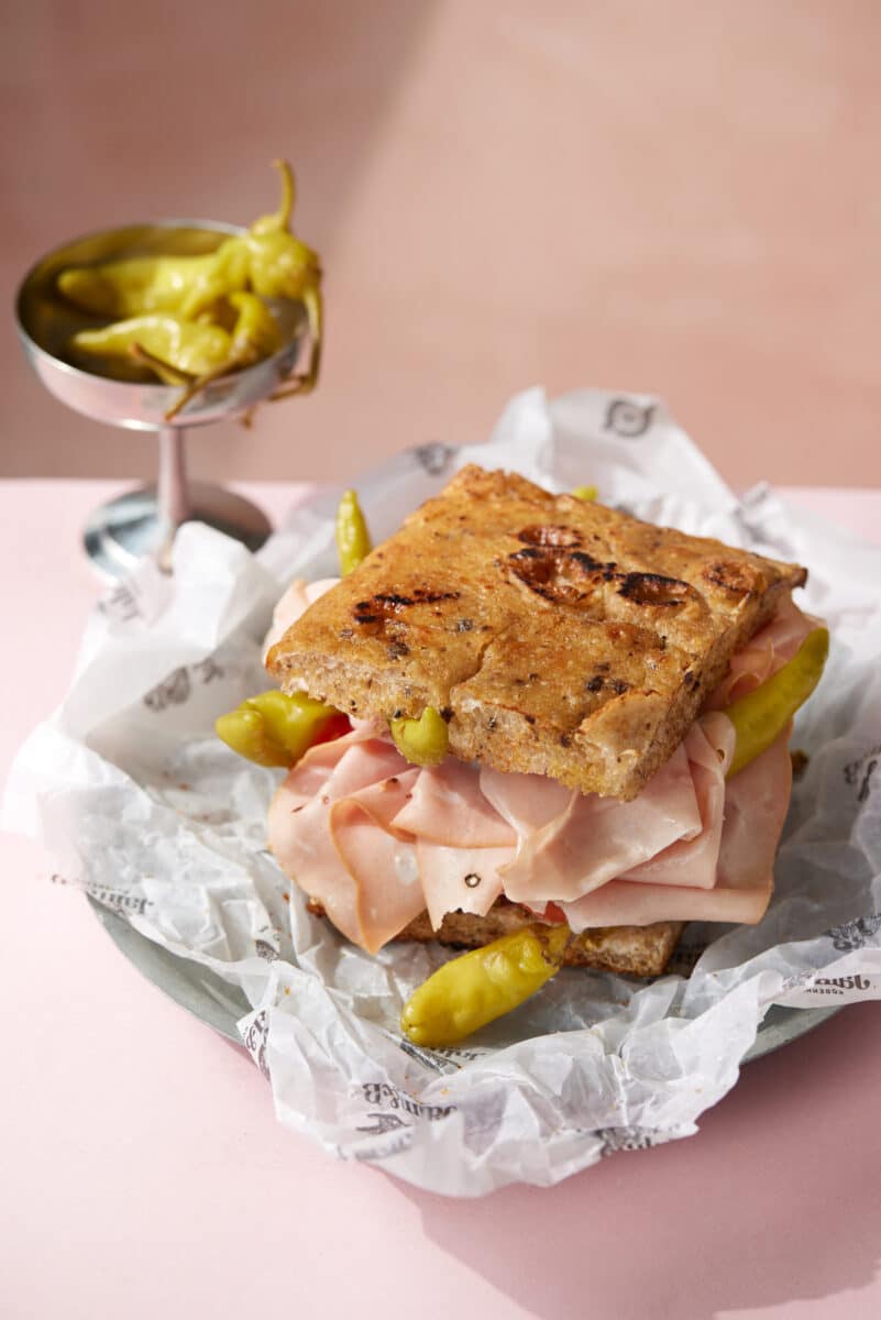Server straks, og nyd din lækre Foccacia Sandwich med Mortadella og Peperoncini!