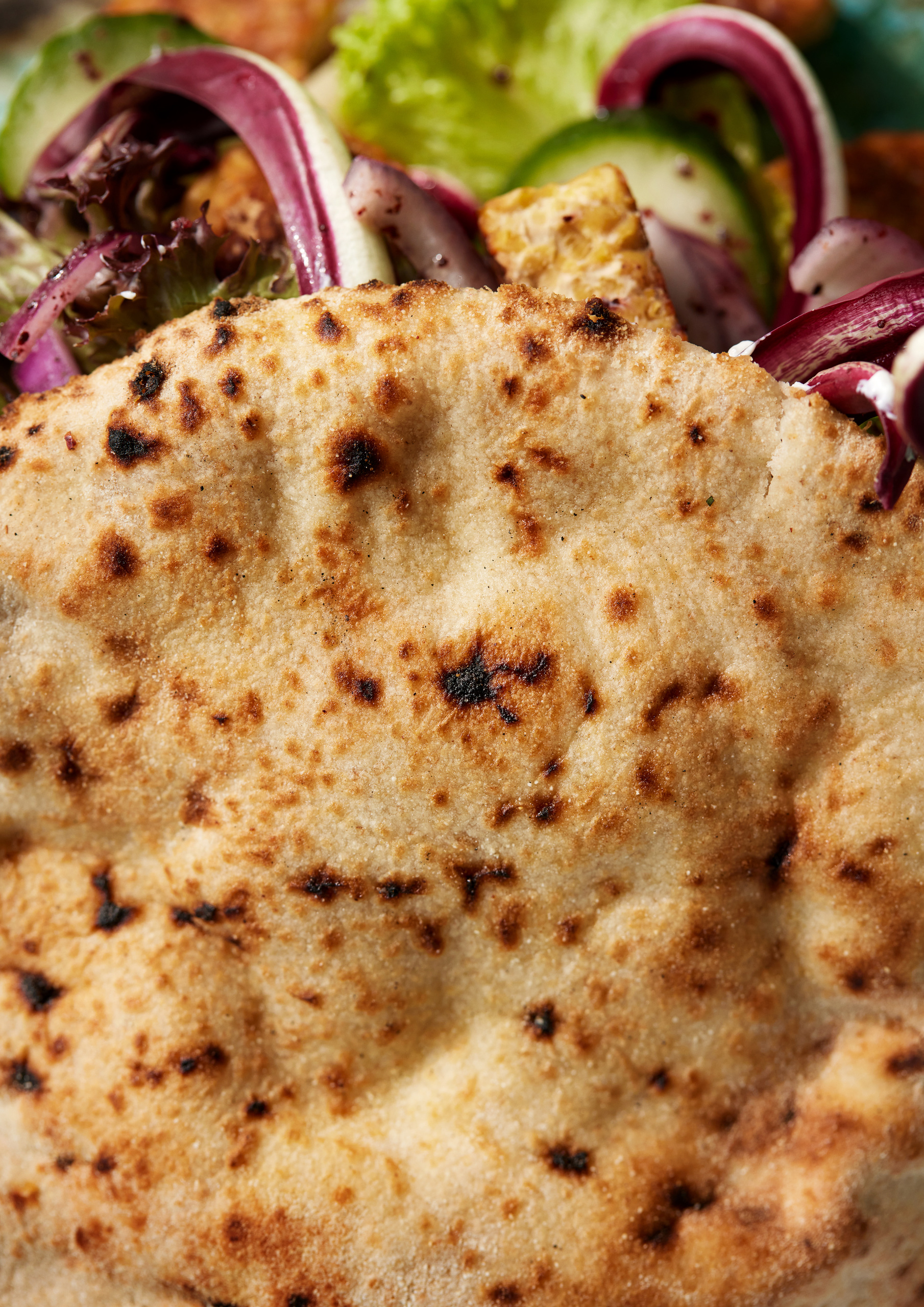 Tænd din ovn på 200 grader varmluft. Skyl og slyng salaten, og læg den til side.Skær agurken i aflange skiver.Skær løgene i halve og skær tynde både. Vend dem i olivenolie, salt og sumac.Lav dressingen ved at blande creme fraiche med 2 fed revet hvidløg, fint revet citronskal, salt og peber efter smag.Skær tempeh i mundrette stykker og steg dem i olie på en pande, indtil de er gyldne og sprøde.Stænk pitabrødene med lidt vand og læg dem i ovnen i 3 minutter.Vend salaten i en dressing lavet af 1 del balsamico og 1 del olivenolie.Anret pitabrødene ved at starte med dressing i top og bund og bygge op nedefra.Tilføj tempeh, agurkskiver, stegte løg og til sidst den marinerede salat.Top det hele med lidt ekstra dressing, sumac og citronsaft efter smag.Server straks og nyd dine vegetariske pitabrød!