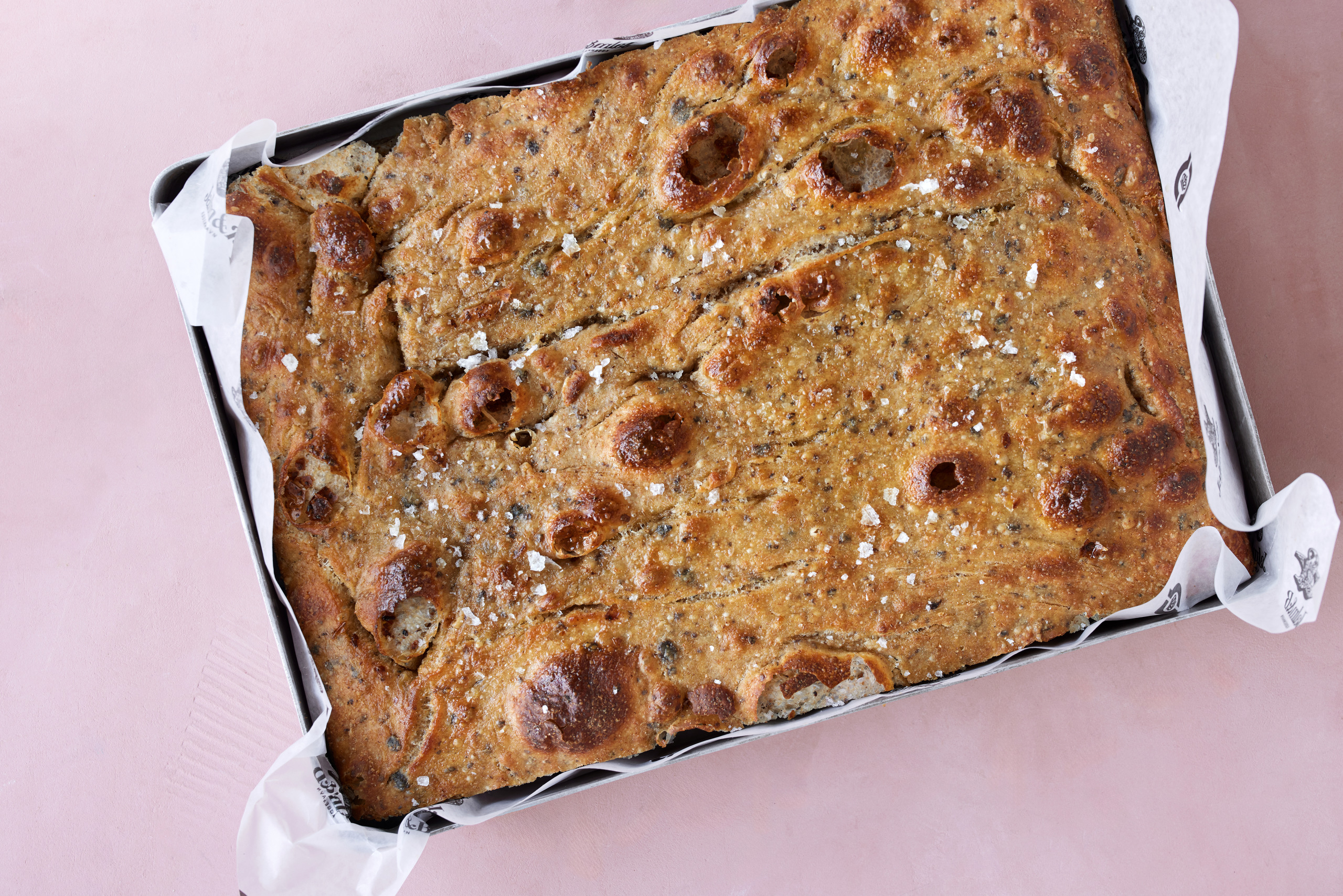 Artisan Focaccia er baseret på Jalm&B's efterhånden velkendte Artisan brøddej, som er koldhævet udelukkende på fordej og surdej i op til 24 timer for at få den helt rigtige fermentering. Det giver en fyldig syrlighed, en sej og saftig krumme og en markant smag af ølandshveden fra Samsø og den ristede havre. Toppet med havsalt og extra jomfruolivenolie. Perfekt som madbrød og sandwichbrød.