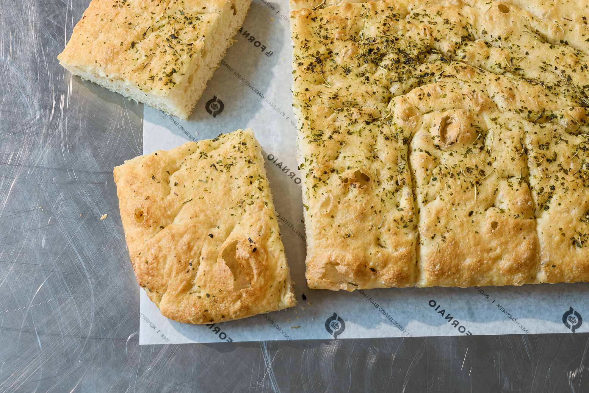 Stort fladt focaccia med indbydende farvespil i skorpen fra friske urter i olivenolien. Italiensk inspireret, bagt på hvedesurdej og italiensk tipo 00 hvedemel. Focacciaen håndformes og toppes med havsalt samt frisk blendet urteolie baseret på jomfru olivenolie med rosmarin og bredbladet persille. Udstanset i 10 stykker for effektiv håndtering af mange sandwich.